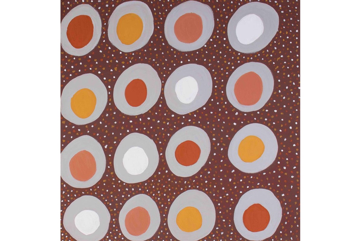 This is stone country - when I walk across this country there are lots of rocks and little stones. In the wet seasons the rivers are filled with coloured stones. This image also refers to a corroboree story given to the artist by her grandfather which describes the boundaries of the stony Miriwoong country as well as a representation of her mother's traditional country at Woorre Woorrem, east of Kununurra in the Kimberley region.