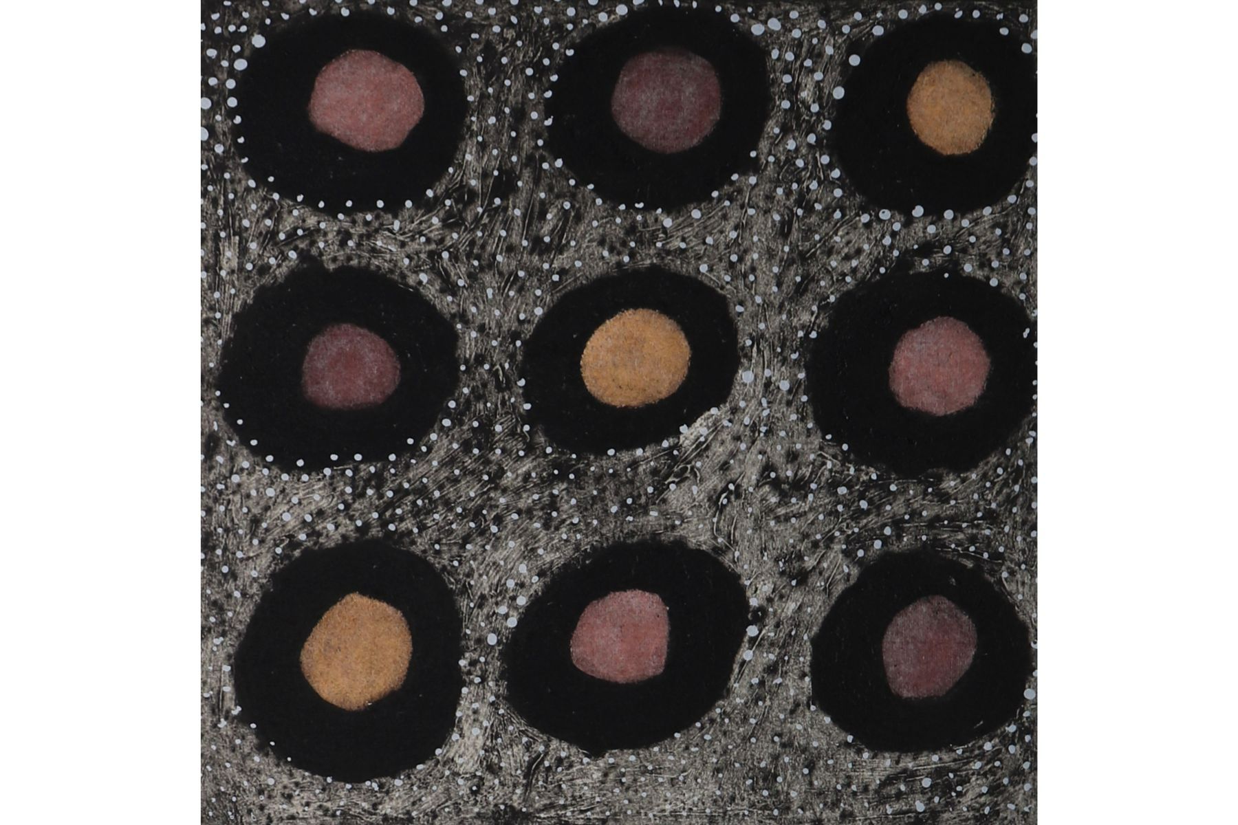 This is stone country - when I walk across this country there are lots of rocks and little stones. In the wet seasons the rivers are filled with coloured stones. This image also refers to a corroboree story given to the artist by her grandfather which describes the boundaries of the stony Miriwoong country as well as a representation of her mothers traditional country at Woorroo Woorrem east of Kununurra in the Kimberley region.