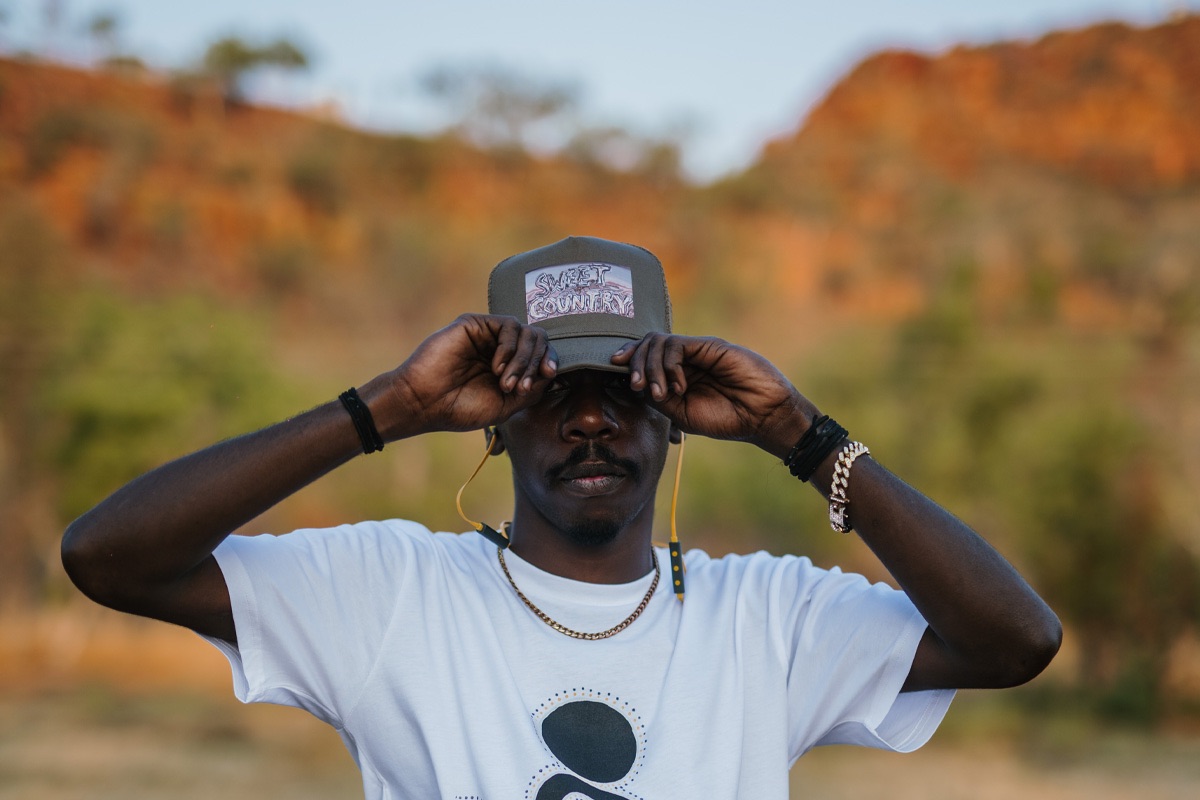 MCA Store x Waringarri Arts collaboration. Limited edition trucker cap featuring David Brown's artwork 'Sweet Country'.