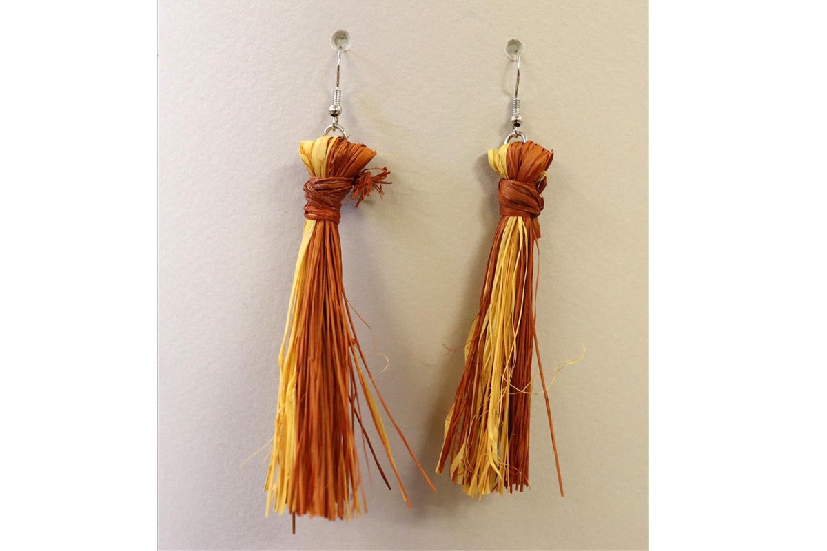 The artist celebrates her ancient culture through her weaving practice and pays tribute to her ancestors in these earrings, this maintains connections to the past, present and the future. Merrepen is a fibre from the Cabbage Palm. There is a lengthy process of gathering the palm fronds, stripping the leaves to reveal the fibre. The roots of Pognolobus reticulatus are ground to make a yellow-orange dye. The dyes are gathered on country, ground, dried, and then boiled until the colour is released. The Merrepen fibres are added, and simmered until the rich colours appear. After drying, they are painstakingly sorted and crafted into this beautiful design.