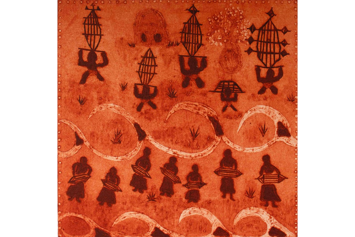 In this painting the dance of the Bali Bali Balga is represented. This traditional dance is an intrinsic aspect of cultural life and is still regularly performed in the Kimberley. In the Bali Bali Balga, dancers carry large thread cross totems on their shoulders and move with stamping feet and swaying body movements to the accompaniment of song and clapping boomerangs. The thread-cross constructions of brightly coloured wools represent key elements or characters of the Bali Bali Balga dance story which include the seven sisters, the morning star, the hills of Bullo River, two sailing ships, the Bali Bali ghost and the songman.