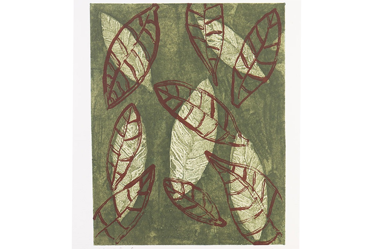 Dora has painted the leaf of a white gum tree, Warlarring. "The leaves are used for smoking once someone passes away and the bark, they used to burn the bark and use the ashes to chew bush tobacco with. This makes the tobacco last longer."