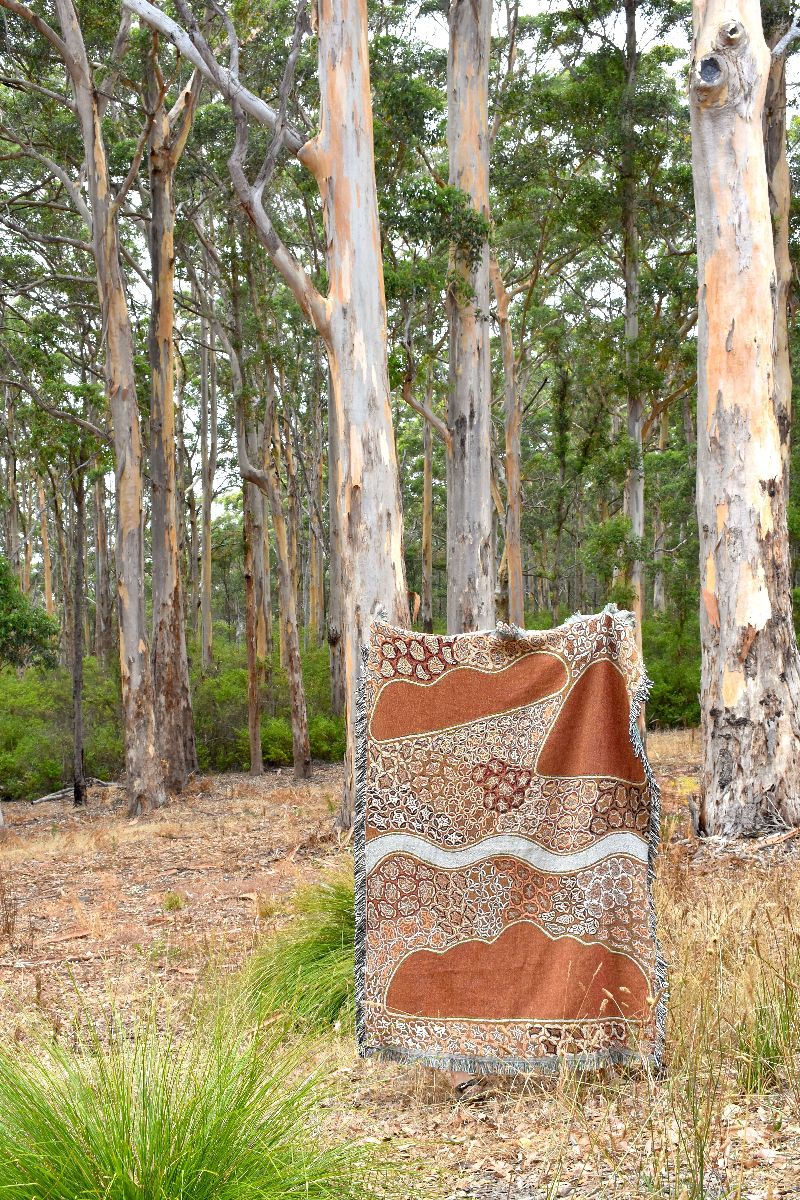Jalin- Beasley Knob is an area of Peggy's traditional Country. It is an important dreaming site for Miriwoong people. In the dreaming Jalin - the plains Kangaroo a Miriwoong man, and Nyangood - the hill kangaroo a Gajirrabeng man, had been arguing at a place called Yab-yabbe-gani-nim about the ownership of Country. This hill represents the place where Jalin and Nyangood separated company. Peggy lives here now; she says this place is still unspoiled and the same as it used to be back when people came here to hunt and camp. During station times Peggy and her family used to go on hunting trips here, camping at one of the many billabongs and then on to Bubble Springs before going back to work on Newry Station. In the background, Peggy has depicted other hills on her Country surrounded by clusters of spinifex.