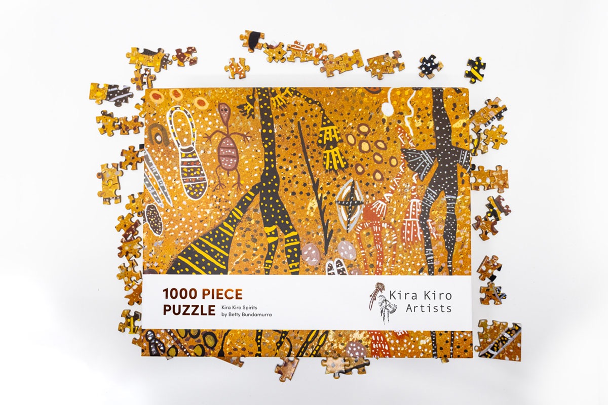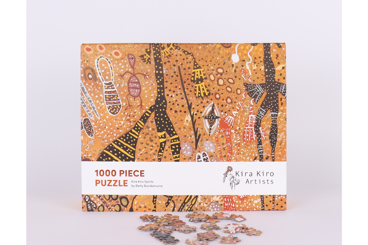 1000 piece puzzle featuring the artwork 'Kira Kiro Spirits' by Betty Bundamurra.