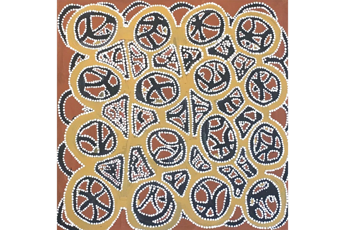 In this image of the drying and cracked mud of her mother’s country along the Sturt River, the artist describes the area where she visited as a child. Along the banks and waterholes by the river was black soil country. “When we were young, my sisters and cousins would play in the dried and cracked mud flats. The Luga, (pronounced 'Looka') is the name we had for the dried mud flats. In the wet seasons and after a big tide on the Sturt River the water would rise up on the black mud flats. As it dried mud would turn to salt crystals. We would play making cakes from the dried shapes and sometimes play a game like stepping stones. Sometimes the old people would eat these cracked mud cakes as bush medicine for the salt. My paintings keep alive my memories from when we were all young and together.”