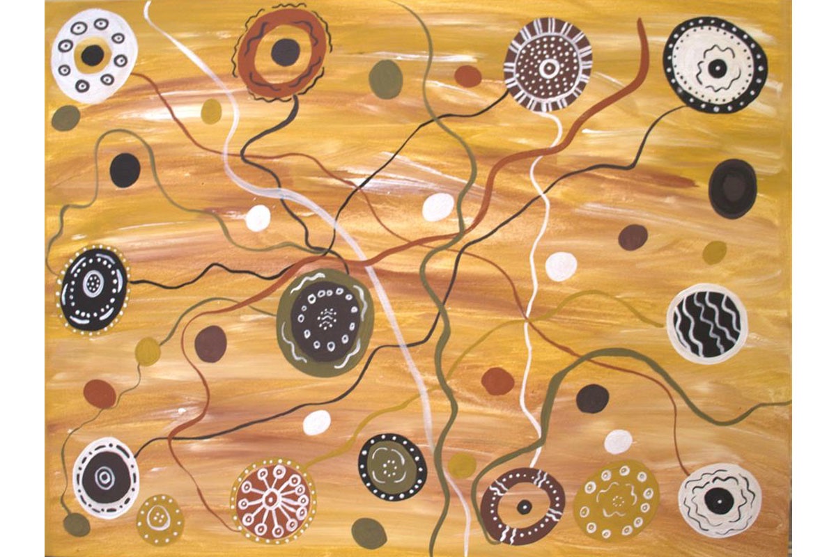 The story of the waterhole tells me that my people used to walk in the bush looking for food. In the waterhole we have bush tucker like fish, bush yam, turtle and goanna. The brolga reminds me of the old people dancing and that the feather of the brolga is used to make a feather belt. The diver duck is sometimes good to eat after its cooked in the fireplace. The lily in the pond was eaten by our people. They ate the roots and flowers.