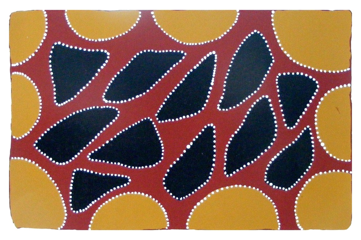 Janayiwom Country - This is my country west of Kununurra in the East Kimberley region of Western Australia. There is a big hill here. The hill is the dreaming for Bull Ants. The small shapes in the painting are the bull ant eggs. This is part of my country. Around the edge of the print are lots of smaller hills.