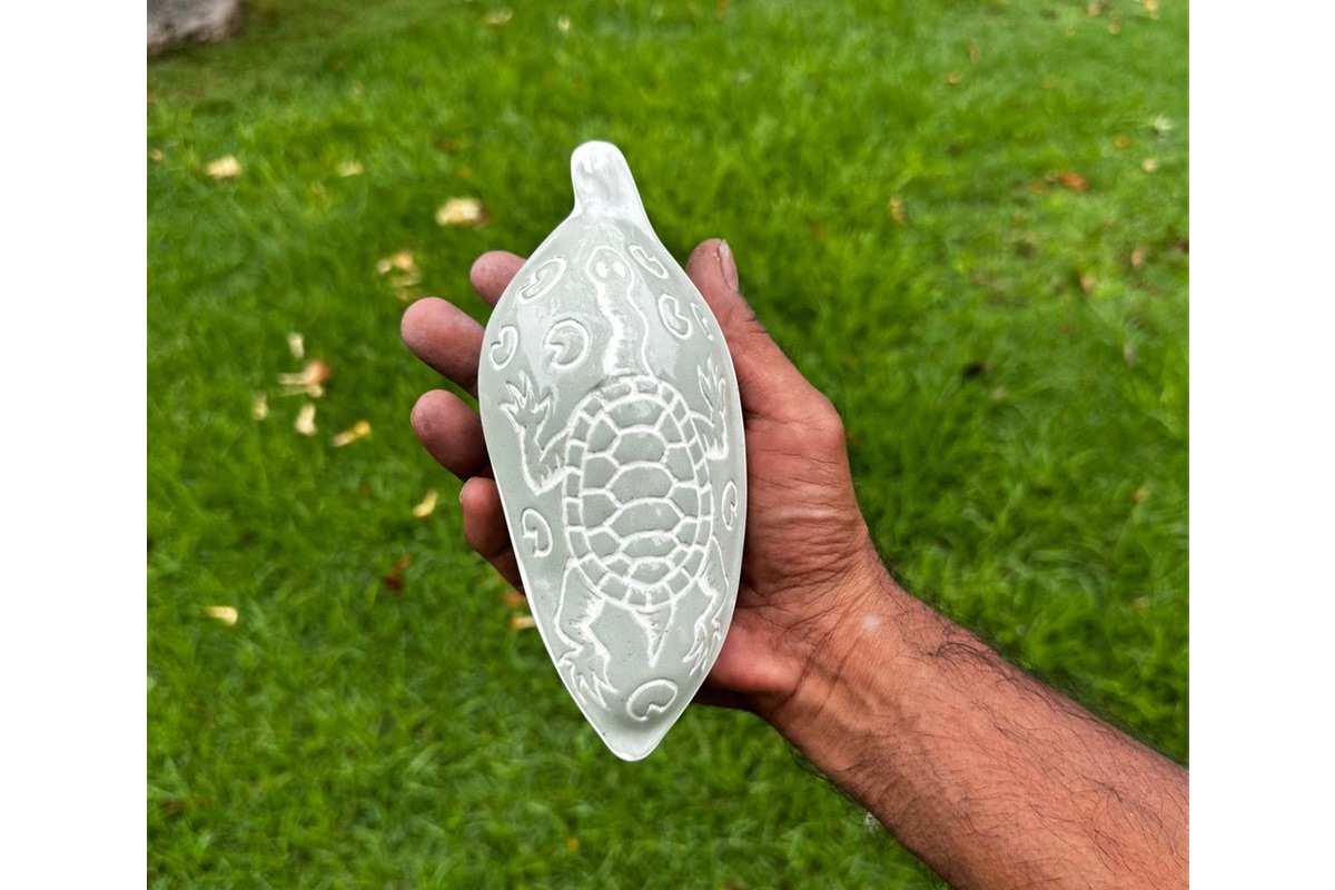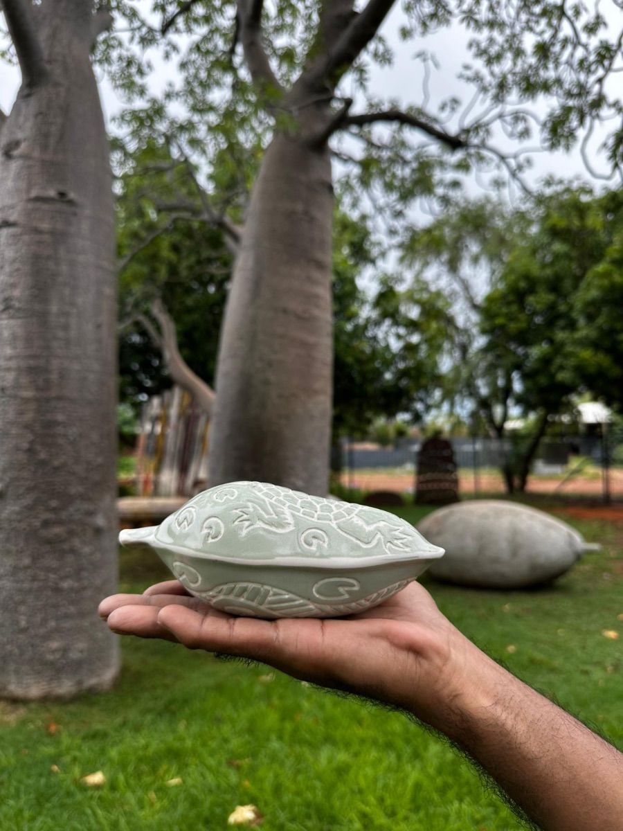 These animals carved onto the ceramic Boab are part of an ongoing telling of the stories of where I grew up since I was a kid. They are special to us as both totems and for food. They are important cultural figures. These animals occur right from my father’s side in the west in Broome /Karajarri Country through my mother’s land Gija Country in the East Kimberley.