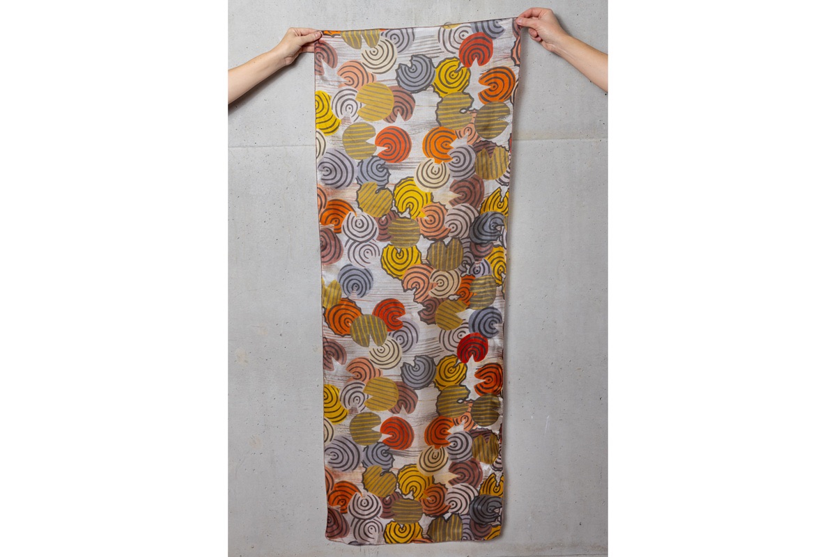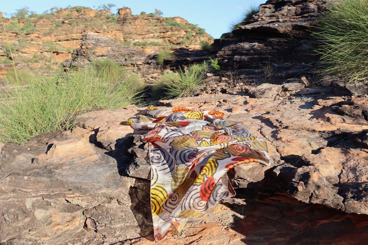 Woorrilbem holds a history. A blast from my grandmother's past as a child she went to this billabong to collect the lily flowers, its bulb, mussels and other edible bush food to take back to her family. One particular day on a usual walk she saw two strange men way off in the distance. A manager on horse back and a black tracker leading a donkey with a sack on its back. They were tracking Aboriginal, Miriwoong people to work for the manager at the station. As the men came closer, my grandmother slipped into the billabong to hide until the men were out of sight. My grandmother then got out and started running as fast as she could back to her family, but it was too late as the strange men were already approaching the camp. With mixed emotions my grandmother spoke and pointed at the same time to the strange men, but the black tracker spoke in Miriwoong language and said they were friendly people looking for workers to work at the station for sugar, tea and tobacco as rations and brought flour to make bread as a peace offering. Some Miriwoong people did go to work for the strange manager man. My grandmother and her family stayed on country. If we don't carry this story and tell our children the history of Woorrilbem and its beauty will take over and my grandmother's Country will be lost and forgotten forever. The different coloured lily pads are my grandmothers emotions flowering through the billabong. The green lily pads are the original colours covering the history of my grandmother's story. The straight lines represents the calm relaxing billabong before my grandmother entered the water.