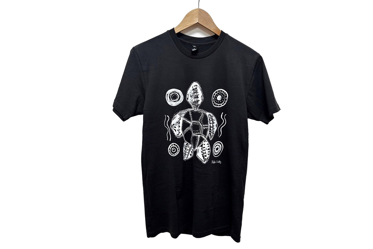 100% cotton T-shirt with reproduction of Matilda Oxtoby's artwork 'Green Turtle (Juluwarru)'.