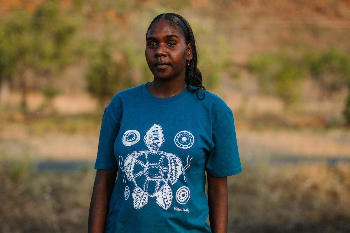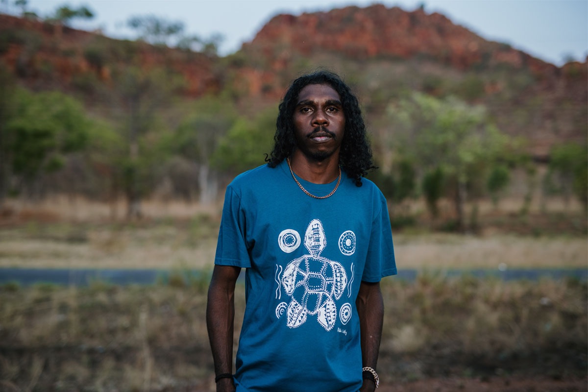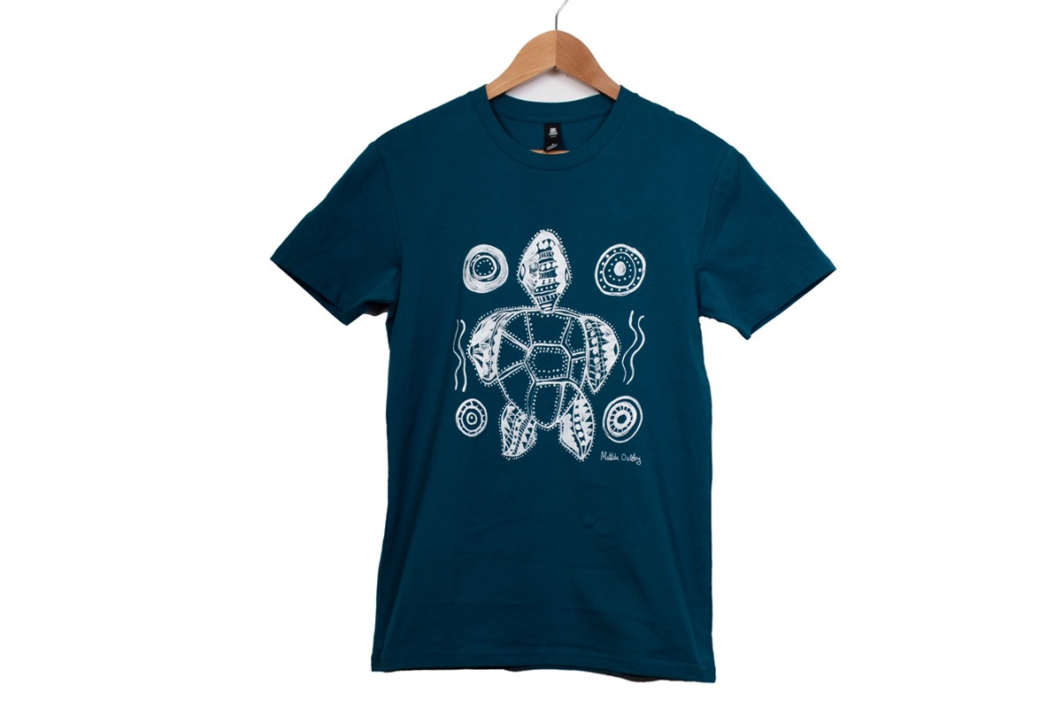 100% cotton T-shirt with reproduction of Matilda Oxtoby's artwork 'Green Turtle (Juluwarru)'.
