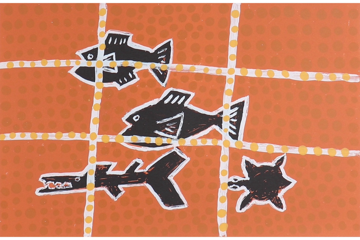 Richie has depicted three different fish and a turtle all swimming together. There are two barramundi - a big one and a small one. They are good for eating.